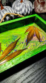 Two Preserved Cannabis Leaves adorning a green and pink painting with glitter in a acrylic paint pour on a wooden shadowbox.
